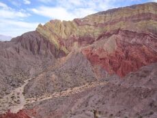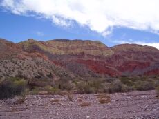 fault contacts between differently-colored sedimentary formations, Andes 2005