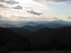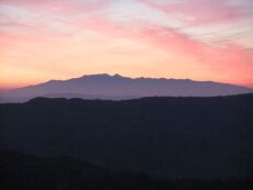 Blick auf das Piringebirge (Südwestbulgarien) von Nordwesten bei Sonnenaufgang. Das Piringebirge ist eine komplexe, geologisch zu den Rhodopen gehörende Horststruktur. Die den Horst im Osten und Westen begrenzenden Abschiebungen sind späteozänen bis oligozänen und miozänen Alters und hängen mit der Extension in der Ägäis zusammen (s. Georgiev et al., 2010).