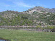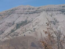Jurassische Sedimente (am Fuß des Berges, braun) und kretazische Kalksteine bei Peca (Südalbanien). Die beiden parallel zueinander verlaufenden Baumreihen im oberen Teil des Berges befinden sich nahe der Grenze Unterkreide-Oberkreide und zeichnen die Ausbisse von (wasserreicheren?) Schichten nach.