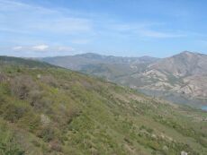 Durch das Tälchen im Mittelgrund verläuft die flachwinklige Kyuse-Hasanlartepesi-Abschiebung, die das amphibolitfaziell metamorphe Grundgebirge der Rhodopen (links, westlich) von syntektonischen späteozänen bis oligozänen Sedimenten und Vulkaniten des Ostrhodopen-Beckens (rechts, östlich) trennt (Zentralrhodopen, Südbulgarien) (s. Pleuger et al., 2011).