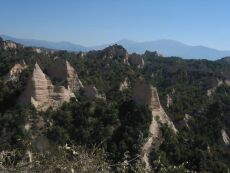 Erdpyramiden bei Melnik (Südwestbulgarien). Die Pyramiden bestehen aus miozänen Sedimenten des Struma-Halbgrabens. Im Hintergrund der Südteil des Piringebirges (s. Georgiev et al., 2010).