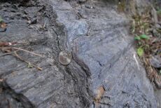 Conjugate shear fractures affecting volcanic bombs within Miocene pyroclastic deposits of the Coastal Range, Eastern Taiwan. Coin for scale (bottom center next to the left fracture).