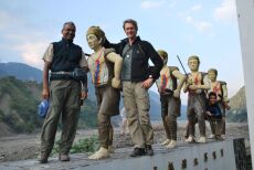 Ravi Kanda (left), K. Ustaszewski (third from left) and Xavier Sengelen (second from right, crouching) with four statues of unnamed Taiwanese aboriginal hunters, near Baolai, southern Cross Island Highway. October 2010.
