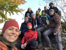 Gruppe 2 mit den Betreuenden Deon (links hinten), Philipp (rechts hinten) und Madeline (vorne links) am Aufschluss der Typlokalität des Adorfer Kalk.