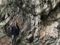 Philipp vor einem Aufschluss nahe Giershagen. Alterierte Basaltoide aus dem Mittleren Devon verzahnen mit Sedimenten.