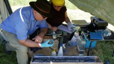 Foto: Robert LehmannÜber die vielfältigen Arbeiten für unser Feldteam um Prof. Kai Uwe Totsche am Bohrplatz, wie z.B. Qualitätskontrolle während Bohr- und Ausbauarbeiten der Grundwassermessstellen, lithologische Bohrkernbeschreibung durch Dr. Michaela Aehnelt, Kamerabefahrungen und Probenahmen etc. informieren wir mit den Bildergalerien und Teil 2 (folgt in Kürze).