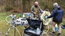 Prof. Dr. Kai Uwe Totsche (l.) und Umweltschutztechniker Heiko Minkmar entnehmen Grundwasserproben aus einer Forschungsmessstelle des Lehrstuhls für Hydrogeologie