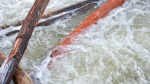 Hochwasser, u.a. infolge extremer Niederschläge birgt Katastrophenpotenzial: Schwemmholz in einem hochwasserführenden Fluss