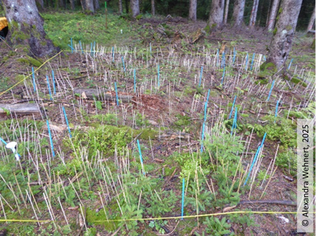 Im ersten Arbeitspaket erfolgt die Inventur der Bestandes-, Totholz- und Verjüngungssituation vor und nach der Etablierung der Totholzvarianten. Auf diese Weise können die Effekte der verschiedenen Totholzvarianten auf die Verjüngungsetablierung (Verjüngungsdichte, Baumartenzusammensetzung, Wachstum, Verbiss) dokumentiert werden.