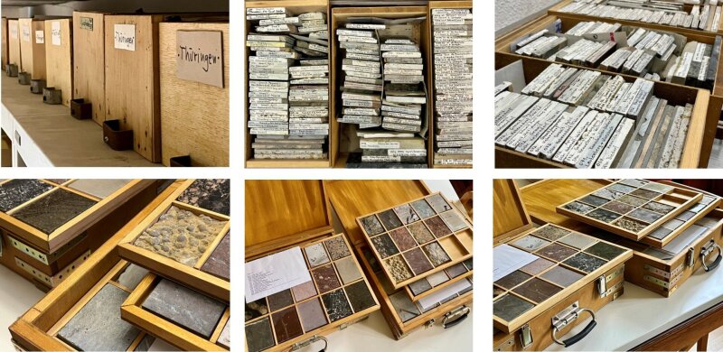 Im Oktober 2025 schenkte Herr Frank Leschke, langjähriges aktives Mitgleied des Thüringischen Geologischen Vereins (TGV), Teil seines Lebenswerks dem IGW. Es handelt sich um eine umfangreiche Sammlung von formatierten Gesteinsplatten, geordnet in ca. 30 Karteikästen mit jeweils ca. 45 gesägten Gesteinsscheiben im Format 9*12*1 cm. Die meisten Stücke stammen aus Thüringen, untergeordnet auch aus Schottland und Skandinavien. Die Sammlung ist vor allem für Thüringen ein kompakter und einzigartiger regionalgeologischer Schatz, der wohl alle in Thüringen anstehenden Gesteine abdeckt. Viele Proben stammen von temporären, inzwischen unzugänglichen oder verfallenen Aufschlüssen. Die Sammlung eignet sich hervorragend für didaktische Zwecke, z.B. zur selektiven Ausstellung auf Tagungen, in öffentlichen Veranstaltungen, im Schulunterricht oder auf Exkursionen. Sie wird am Institut von Thomas Voigt betreut, derzeit digital inventarisiert, und voraussichtlich Mitte 2026 in einer Sonderausstellung in der Mineralogischen Sammlung präsentiert werden.