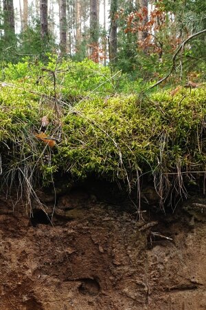Cross-section through the forest floor. Before rainwater reaches the ground, it passes through various layers of vegetation. It first falls through the canopy of the tree tops, then penetrates through shrubs and finally through the herb and moss layer.