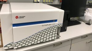 The CytoFLEX LX flow cytometer from Beckman Coulter is equipped with several lasers from 355 to 808 nm (405 nm, 488 nm, 561 nm, 638 nm) and allows simultaneous detection of several fluorescence signals (21 detectors). It can be loaded with single samples or with a 96-well plate and, thus, allows convenient sample measurement in cell-based assays, such as the quantification and analysis of nanoparticle uptake in cells, the measurement of cell vitality markers, or the expression of certain cellular structures.