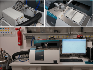 Chemical information on sample systems can be obtained by a fully equipped FT-IR spectrometer (Bruker Tensor 37 with Hyperion microscope and HT-X high-throughput module). By utilizing a home-build Brewster angle holder the sensitivity of the instrument allows even for the investigation of self-assembled monolayers (SAMs). Alternatively, a grazing-angle objective is at hand to study such systems.