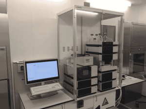 For the production of high-quality nanoscale drug delivery systems, formulation and characterization in a controlled cleanroom environment using the principles of Good Manufacturing Practice are essential. For this purpose, both the polymeric starting materials used for the formulation of the nanoobjects and the active ingredients to be encapsulated, as well as the final produced nanocontainers, must be thoroughly characterized. The key technology for these investigations is a flexibly applicable ultra-high-pressure liquid chromatography (UHPLC), with which various analytes can be accurately checked before and after the manufacturing process.