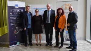 On 9 October, 2018 the presentation of the RegioStars Awards 2018 in Brussels took place as part of the European Week of Regions and CitiesExternal link, and CEEC Jena was also a finalist in the category "Achieving Sustainability through Low Carbon Emissions". We were delighted about the visit of Dr. Babette Winter, State Secretary for Culture and Europe in the Thuringian State Chancellery, Ms. Annelie Zapfe, Consultant for Research, Technology, Innovation Policy and Culture at the Representation of the Free State of Thuringia and Mr. Karl-Heinz Lambertz, President of the Committee of the Regions of the EU, at our booth. The finalist project has been represented by Dr. Alexandra Lex-Balducci from our team of scientific co-ordinators and Volker Kurz, Head of Unit in the administrative and certifying authority ERDF of the Thüringer Ministerium für Wirtschaft, Wissenschaft und Digitale Gesellschaft (TMWWDG).