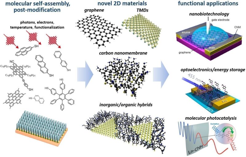 The research activities concentrate on 2D carbon materials (graphene, carbon nanomembranes, organic monolayers) and their hybrids with other low dimensional materials for novel applications in nanoelectronics, nanosensors, energy-saving and nanobiotechnology. This interdisciplinary work embraces (i) growth of these materials with tailored physical and chemical properties, (ii) their nanolithography and microfabrication, (iii) their implementation in novel functional nanostructures for both fundamental studies and applied research.