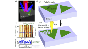 Schematic representation showing the excitation of the patterned MoS2, as well as the procedure of nanopattering of the devices