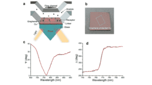Graphene-protected Cu SPR biosensor with its ellipsometric parameters shown in c) and d).