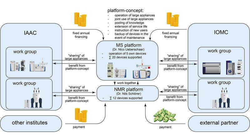 Image: Dr. Nico UeberschaarThe Institutes of Organic and Macromolecular Chemistry (IOMC) and the Institute of Inorganic and Analytical Chemistry (IAAC) have developed a platform concept. At the heart of this concept are jointly financed positions for the heads of the departments and the pooled use of large-scale equipment. This ensures continuity in supervision and compensates for the high fluctuation in doctoral students and postdocs. Furthermore, the platform's knowledge and expertise can be drawn on for complex issues, but also for repairs, and measurements can be outsourced to other devices on the platform, for example. All in all, everyone involved benefits from the operation of a platform, which underlines the sustainability concept of using large-scale instrumentation through this concept.